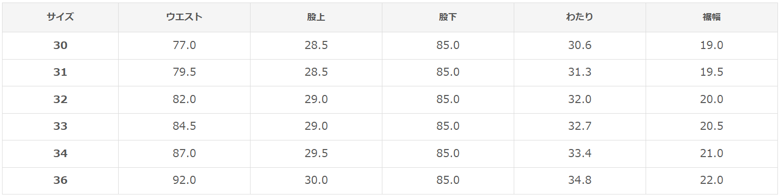 サイズ表【ワンウォッシュ後のサイズ】